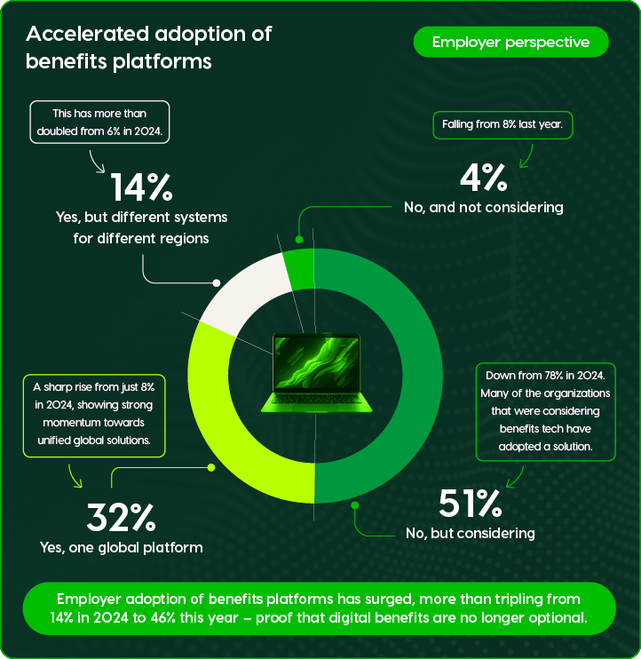 Employer adoption of benefits platforms has surged, more than tripling from 14% in 2024 to 46% this year – proof that digital benefits are no longer optional.
