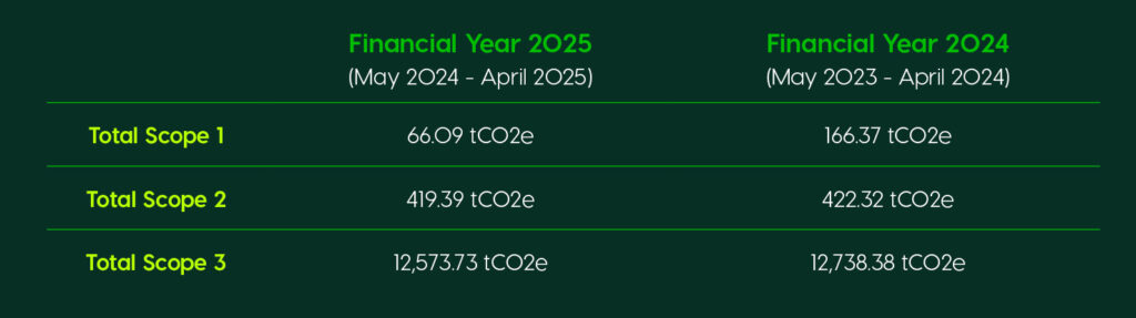 Rapid transformation is taking place across our whole business; from optimising facilities and energy usage, to improving recycling systems, better waste management and promoting electric cars. For Financial Year 2025 (May 2024 – April 2025) our group wide carbon emissions were: